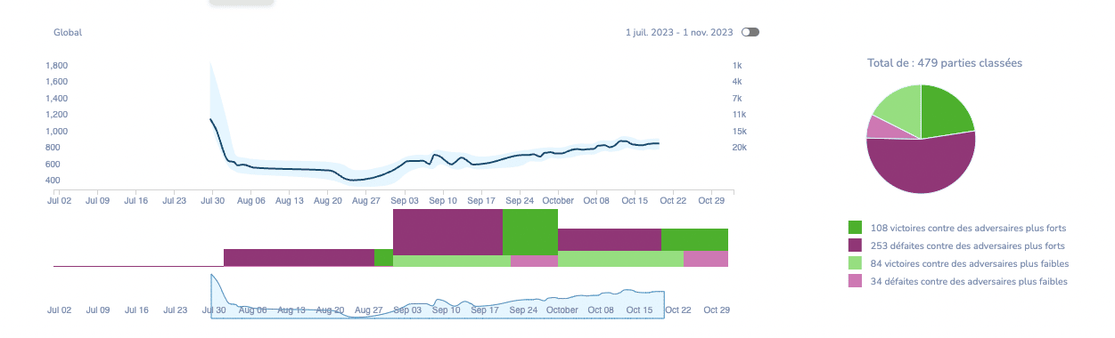 Le pic à gauche de la courbe ne compte pas, c’est un classement arbitraire donné par le site avant les premières parties. |